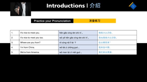 1. It's nice to meet you. hěn ɡāo xìnɡ rèn shí nǐ 。 很高兴认识你。