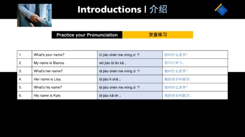 2. My name is Bianca. wǒ jiào bǐ ān kǎ 。 我叫比安卡。