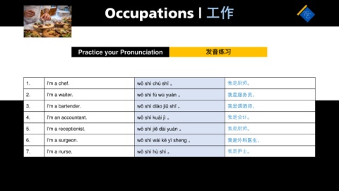 5. I'm a receptionist. wǒ shì jiē dài yuán 。 我是厨师。
