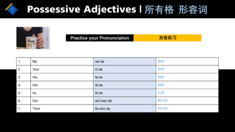 Possessive Adjectives | 所有格 形容词 Practice your Pronunciation 发音练习 1. My wǒ de 我的 2. Your nǐ de 你的 3. His tā de 他的 4. Her tā de 她的 5. Its tā de 它的 6. Our wǒ men de 我们的 7. Their tā men de 他们的