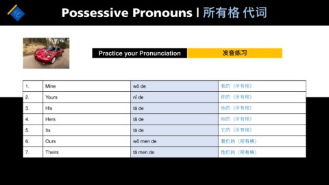 Possessive Pronouns | 所有格 代词 Practice your Pronunciation 发音练习 1. Mine wǒ de 我的(所有格) 2. Yours nǐ de 你的(所有格) 3. His tā de 他的(所有格) 4. Hers tā de 她的(所有格) 5. Its tā de 它的(所有格) 6. Ours wǒ men de 我们的(所有格) 7. Theirs tā men de 他们的(所有格)