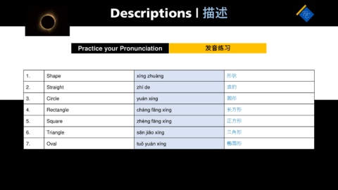 Descriptions | 描述 Practice your Pronunciation 发音练习 1. Shape xínɡ zhuànɡ 形状 2. Straight zhí de 直的 3. Circle yuán xínɡ 圆形 4. Rectangle chánɡ fānɡ xínɡ 长方形 5. Square zhènɡ fānɡ xínɡ 正方形 6. Triangle sān jiǎo xínɡ 三角形 7. Oval tuǒ yuán xínɡ 椭圆形