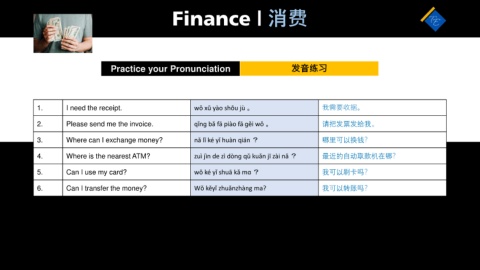 6. Can I transfer the money? Wǒ kěyǐ zhuǎnzhàng ma? 我可以转账吗?