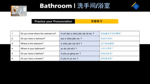 4. Where is your bathroom? yù shì zài nǎ lǐ ? 浴室在哪里?