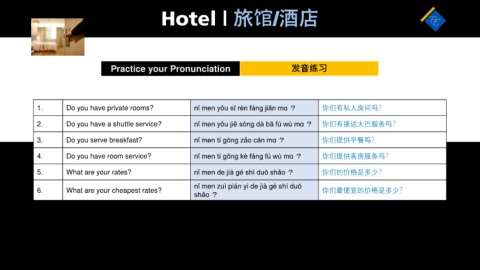 4. Do you have room service? nǐ men tí ɡōnɡ kè fánɡ fú wù mɑ ? 你们提供客房服务吗?