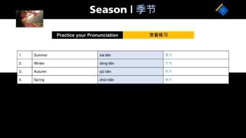 Season | 季节 Practice your Pronunciation 发音练习 1. Summer xià tiān 夏天 2. Winter dōnɡ tiān 冬天 3. Autumn qiū tiān 秋天 4. Spring chūn tiān 春天