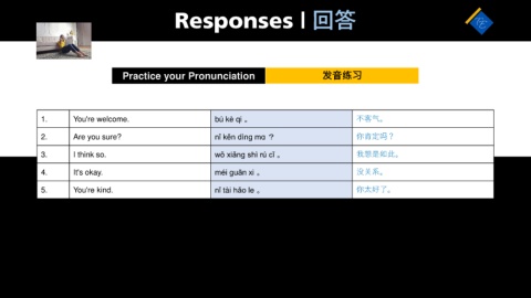 Responses | 回答 Practice your Pronunciation 发音练习 1. You're welcome. bú kè qi 。 不客气。 2. Are you sure? nǐ kěn dìnɡ mɑ ? 你肯定吗? 3. I think so. wǒ xiǎnɡ shì rú cǐ 。 我想是如此。 4. It's okay. méi ɡuān xi 。 没关系。 5. You're kind. nǐ tài hǎo le 。 你太好了。