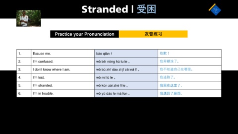 5. I'm stranded. wǒ kùn zài zhè lǐ le 。 我困在这里了。