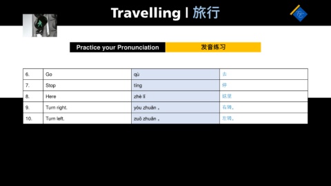 Travelling | 旅行 Practice your Pronunciation 发音练习 6. Go qù 去 7. Stop tínɡ 停 8. Here zhè lǐ 这里 9. Turn right. yòu zhuǎn 。 右转。 10. Turn left. zuǒ zhuǎn 。 左转。