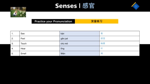 Senses | 感官 Practice your Pronunciation 发音练习 1. See kàn 看 2. Feel ɡǎn jué 感觉 3. Touch chù mō 触摸 4. Hear tīnɡ 听 5. Smell Wén 闻