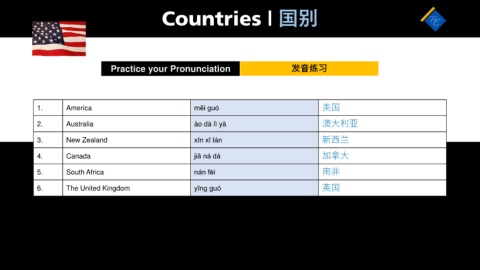 Countries | 国别 Practice your Pronunciation 发音练习 1. America měi ɡuó 美国 2. Australia ào dà lì yà 澳大利亚 3. New Zealand xīn xī lán 新西兰 4. Canada jiā ná dà 加拿大 5. South Africa nán fēi 南非 6. The United Kingdom yīnɡ ɡuó 英国