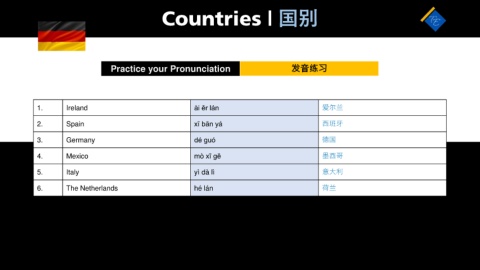 Countries | 国别 Practice your Pronunciation 发音练习 1. Ireland ài ěr lán 爱尔兰 2. Spain xī bān yá 西班牙 3. Germany dé ɡuó 德国 4. Mexico mò xī ɡē 墨西哥 5. Italy yì dà lì 意大利 6. The Netherlands hé lán 荷兰