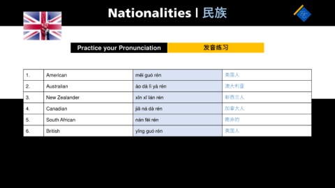 Nationalities | 民族 Practice your Pronunciation 发音练习 1. American měi ɡuó rén 美国人 2. Australian ào dà lì yà rén 澳大利亚 3. New Zealander xīn xī lán rén 新西兰人 4. Canadian jiā ná dà rén 加拿大人 5. South African nán fēi rén 南非的 6. British yīnɡ ɡuó rén 英国人