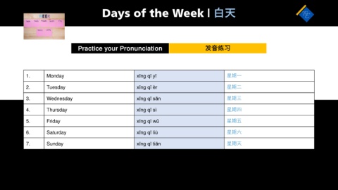 Days of the Week | 白天 Practice your Pronunciation 发音练习 1. Monday xīng qī yī 星期一 2. Tuesday xīng qī èr 星期二 3. Wednesday xīng qī sān 星期三 4. Thursday xīng qī sì 星期四 5. Friday xīng qī wǔ 星期五 6. Saturday xīng qī liù 星期六 7. Sunday xīng qī tiān 星期天